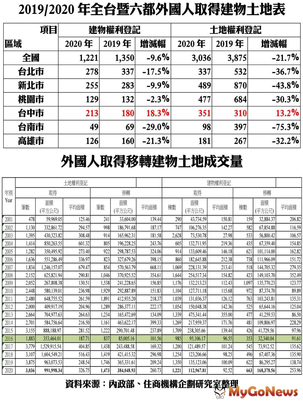 【MyGoNews蕭又安/綜合報導】依據內政部最新統計資料,2020年外國人在台購置不動產,建物取得1221棟,與2020年同期相比減少9.6%,但取得面積減少16.3%,土地有3036筆,與2020年同期相比大幅下滑21.7%,土地取得面積增加3.0%。住商不動產企劃研究室經理徐佳馨分析,近兩年國際間交易深受疫情影響,即便台幣走強、海外資金回流、台商大舉返台,但在房地合一對外國持有人的高稅率與洗錢防制等資金規範下,交易狀況不如預期。